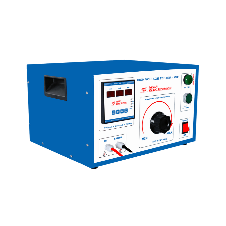 The VEER VHT High Voltage Tester is designed to assess the dielectric strength and insulation quality of electrical equipment as per routine test standards. It applies a controlled high voltage (1 kV + 2× working voltage) to the DUT and automatically trips if leakage current exceeds preset limits. Ideal for component manufacturers, transformer/pump/motor workshops, and calibration labs, the VHT ensures product safety, insulation integrity, and compliance with required standards.