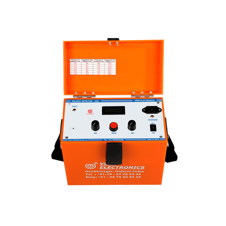 The VEER VHD Holiday Detector identifies pinholes, cracks, and discontinuities in anti-corrosive coatings applied to pipelines, tanks, structures, and coated metal surfaces. The system applies high tension across the coated surface and provides audible and visual alarms when defects are detected. Suitable for pipeline contractors, inspection agencies, and coating applicators.